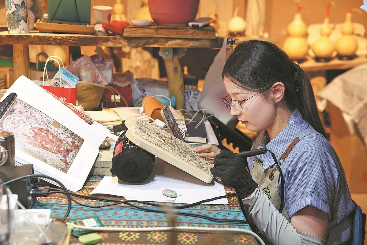 A learner practices pyrography at a studio at Tuyugou Cultural Tourism Town in Shanshan county on Sept 9. WANG ZIRU/CHINA NEWS SERVICE