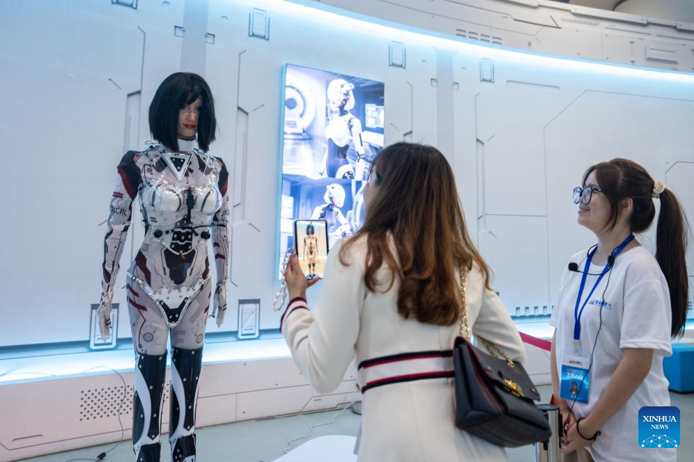 A visitor (2nd R) learns about a humanoid robot displayed at the 4th International Summit on BDS Applications in Zhuzhou, central China's Hunan Province, Sept. 24, 2025. The 4th International Summit on BDS Applications kicked off here on Wednesday. (Xinhua/Chen Sihan)