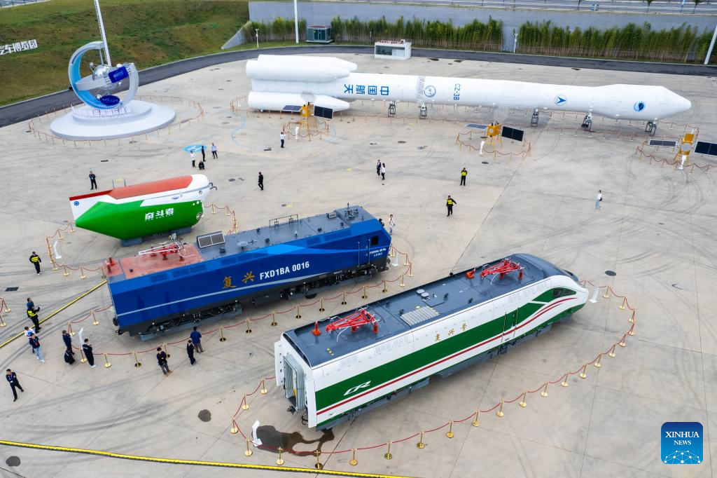 An aerial drone photo shows the outdoor exhibition area of the 4th International Summit on BeiDou Navigation Satellite System (BDS) Applications in Zhuzhou, central China's Hunan Province, Sept. 24, 2025. The 4th International Summit on BDS Applications kicked off here on Wednesday. (Xinhua/Chen Sihan)