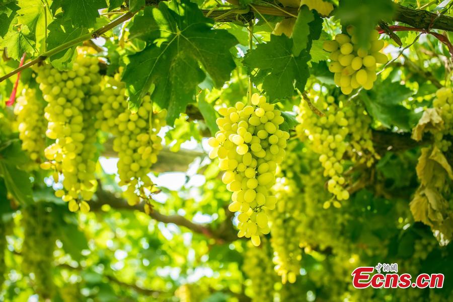 Green, plump grapes are seen in the famed Grape Valley in Turpan, Xinjiang Uygur Autonomous Region. In recent years, Turpan has promoted scientific planting techniques to improve the quality of table grapes. (Photo: China News Service)
