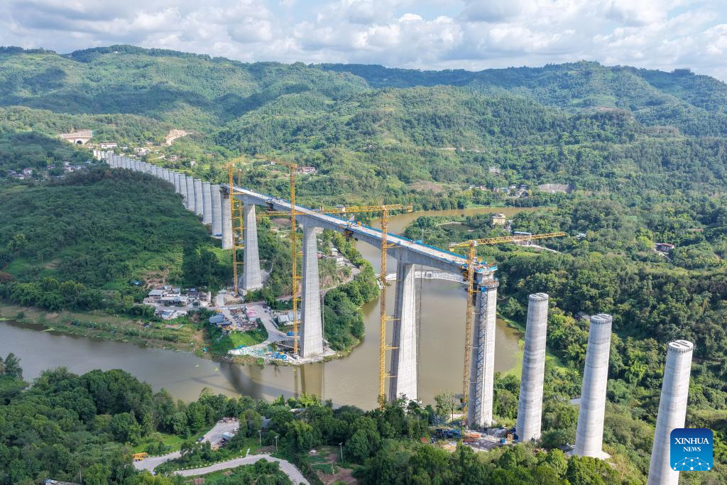 A drone photo taken on Sept. 24, 2025 shows the construction site of a double-track grand bridge along the Chongqing-Wanzhou high-speed railway over the Wubu River in southwest China's Chongqing Municipality. Contracted by China Railway 12th Bureau Group Co., Ltd., the main span of the grand bridge finished its closure on Wednesday, laying a foundation for the opening of the whole line on schedule. (Xinhua/Tang Yi)