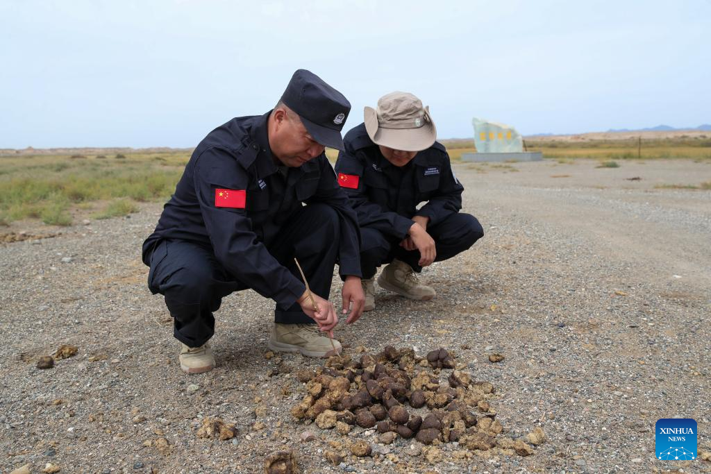 Staff members check feces of the Przewalski's horses in the Dunhuang West Lake National Nature Reserve in Dunhuang, northwest China's Gansu Province, on Sept. 24, 2025. The Dunhuang West Lake National Nature Reserve in Gansu Province covers an area of approximately 660,000 hectares, featuring a diverse ecosystem including wetlands, grasslands, forests and Gobi deserts, which makes it an experimental zone for the wild release of the Przewalski's horses. (Xinhua/Lang Bingbing)