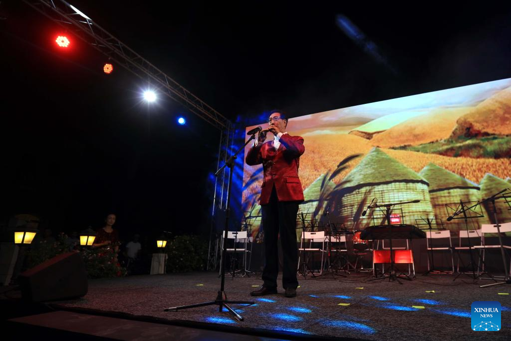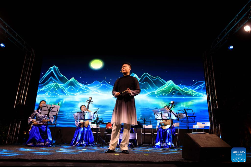 An artist performs during the 2025 "A Moment to Remember -- Mid-Autumn Chinese Folk Concert" staged in Amman, Jordan, on Sept. 24, 2025. The concert was staged here on Wednesday evening, offering Jordanian audiences a vibrant showcase of Chinese folk music. More than 300 delegates from both countries attended the concert. (Photo by Mohammad Abu Ghosh/Xinhua)