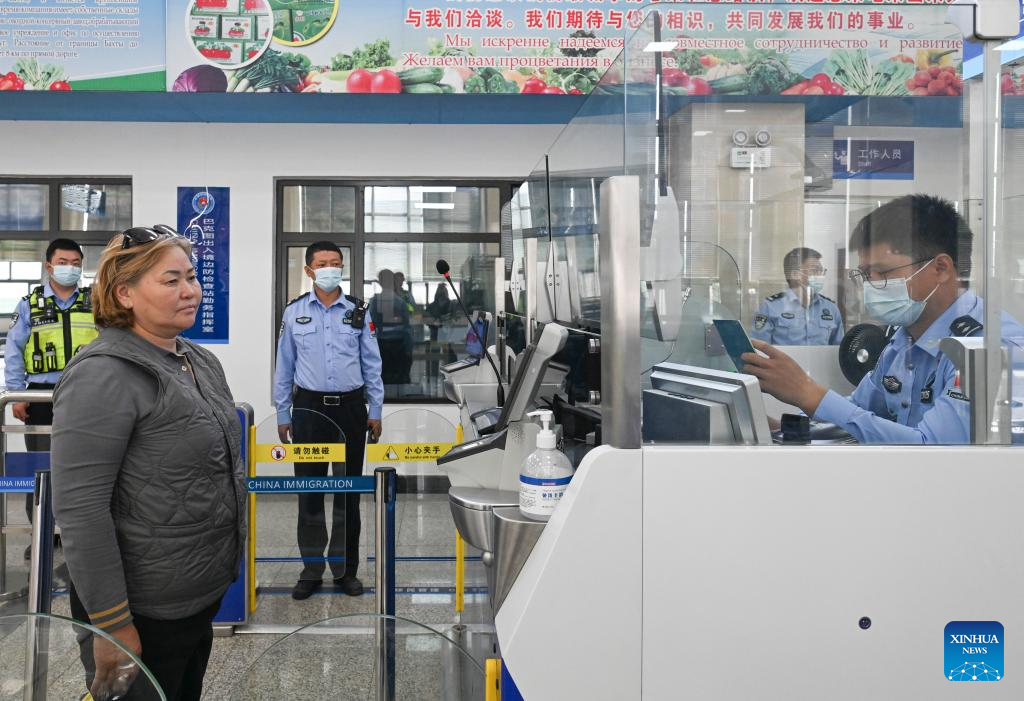 An immigration officer handles entry formality for a passenger from Kazakhstan at Bakti port in Tacheng, northwest China's Xinjiang Uygur Autonomous Region, Sept. 17, 2025. Xinjiang is seeing increased vitality across the board as the region accelerates its efforts to the construction of the New International Land-Sea Trade Corridor, a key logistics network connecting China's western regions to global markets. (Xinhua/Wang Fei)