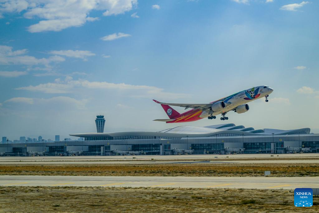An airplane takes off at Urumqi Tianshan International Airport in northwest China's Xinjiang Uygur Autonomous Region, Sept. 15, 2025. Xinjiang is seeing increased vitality across the board as the region accelerates its efforts to the construction of the New International Land-Sea Trade Corridor, a key logistics network connecting China's western regions to global markets. (Xinhua/Chen Shuo)