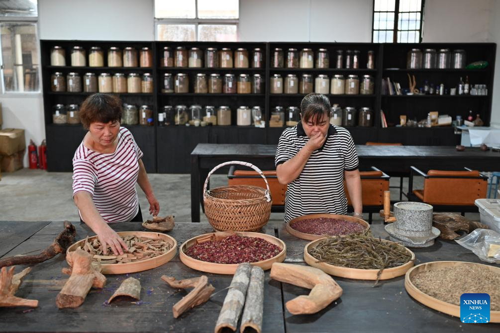 Staff members of an incense-making enterprise select raw materials for natural incense products in Laidian Town, Xianyou County of southeast China's Fujian Province, on Sept. 24, 2025. Xianyou County is a significant trading and distribution center for agarwood and sandalwood in China. In recent years, the county has been working on the development of its incense-related business by leveraging the abundance in raw materials, a mature incense-making industrial chain, and online and offline sales networks there. (Xinhua/Jiang Kehong)