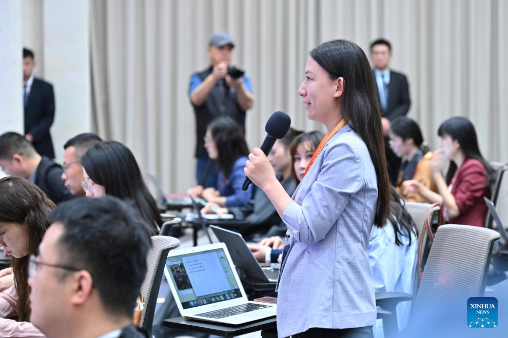 A journalist asks questions at a press conference held by the State Council Information Office (SCIO) on achievements in high-quality development of employment and social security in the 14th Five-Year Plan period (2021-2025) in Beijing, capital of China, Sept. 26, 2025. Wang Xiaoping, China's minister of human resources and social security, and Li Zhong and Yan Qinghui, both vice ministers of human resources and social security, attended the press conference here on Friday. (Xinhua/Li Xin)