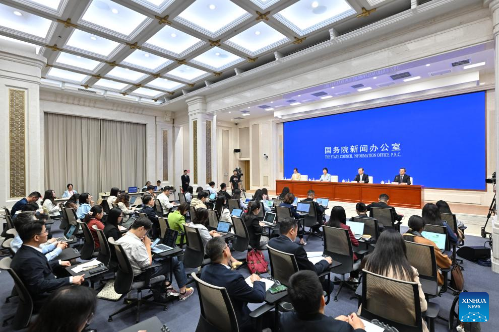 Wang Xiaoping, China's minister of human resources and social security, and Li Zhong and Yan Qinghui, both vice ministers of human resources and social security, attend a press conference held by the State Council Information Office (SCIO) on achievements in high-quality development of employment and social security in the 14th Five-Year Plan period (2021-2025) in Beijing, capital of China, Sept. 26, 2025. (Xinhua/Li Xin)