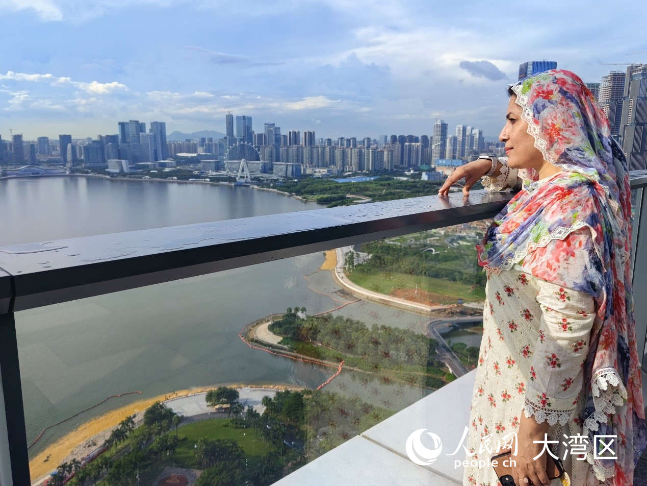 Sara Afzal from Pakistan overlooks Shenzhen Bay from the Qianhai Kerry Center at Shenzhen's Nanshan district, south China's Guangdong Province, Sept. 15, 2025. (People's Daily Online/Wang Jing)