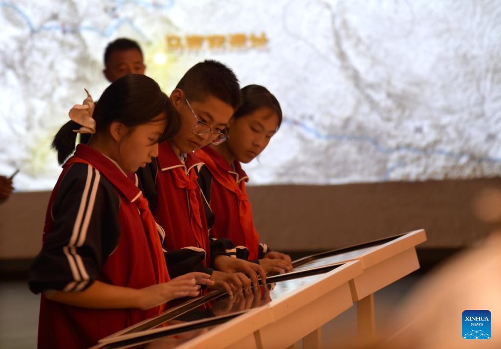 Students learn about Majiayao culture on a digital platform at a study and exhibition center for this culture in Lintao County, Dingxi City, northwest China's Gansu Province, Sept. 26, 2025. The 8th Majiayao Culture Festival kicked off in Lintao County on Friday, featuring thematic study tours, cultural relic exhibitions, painted pottery culture experiences and other activities.