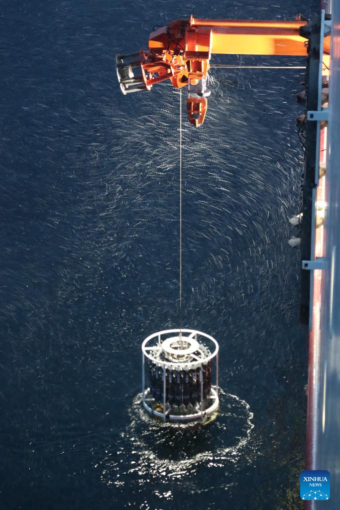 A Conductivity, Temperature, and Depth (CTD) sensor is retrieved to China's research icebreaker Xuelong 2, Sept. 8, 2025. (Xinhua/Liu Shiping)