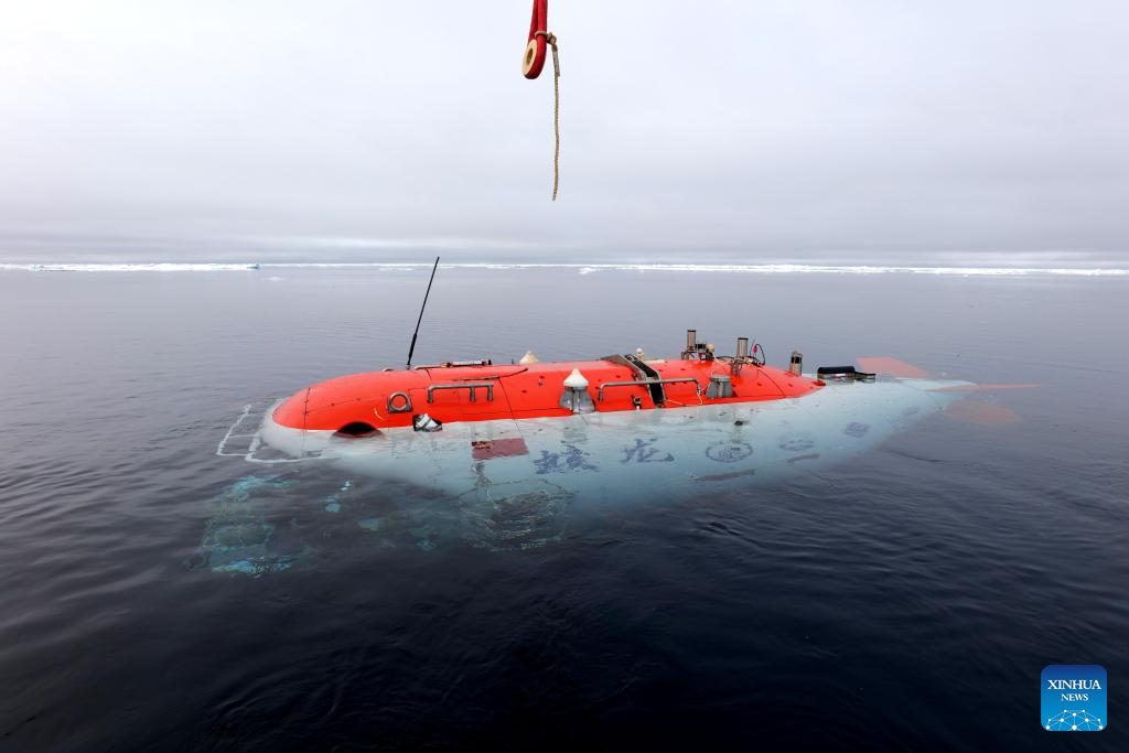 China's manned deep-sea submersible Jiaolong is about to leave its mothership Shenhai Yihao (DeepSea No. 1) in the Arctic Ocean, Aug. 6, 2025. (Xinhua/Liu Shiping)