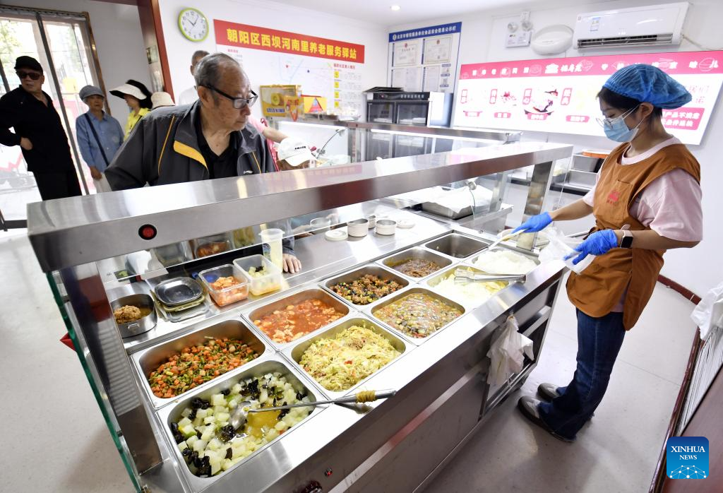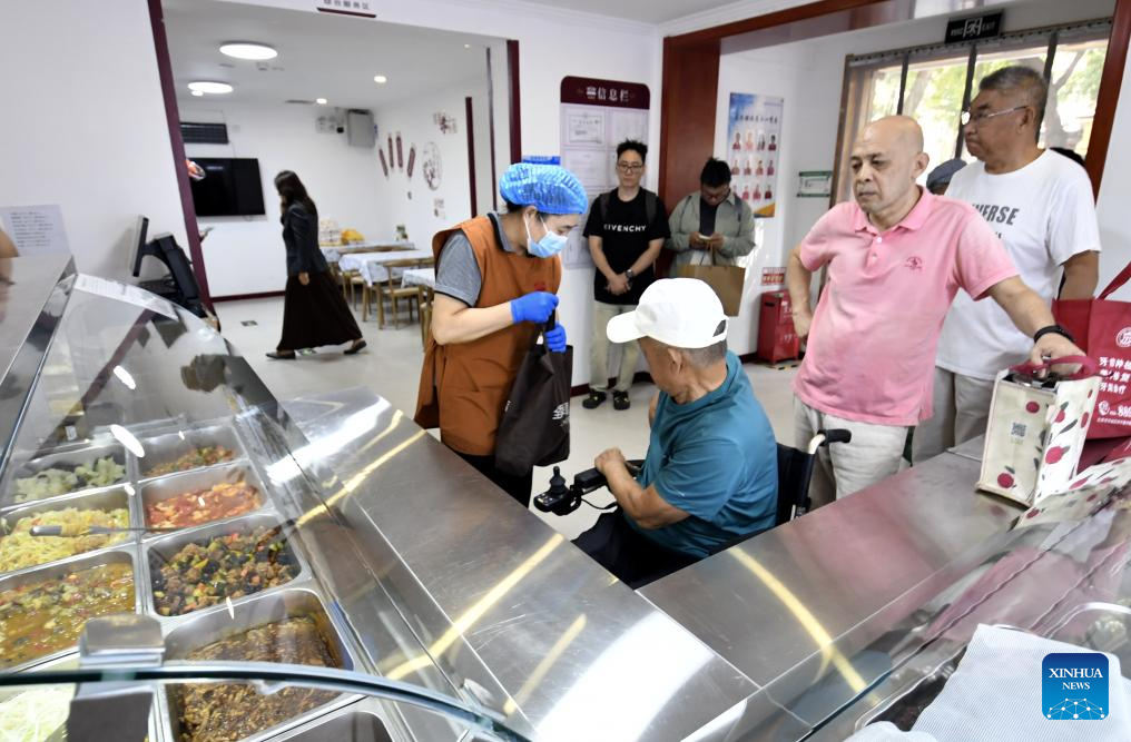 Senior citizens buy lunch at a senior community canteen in Xiangheyuan Neighborhood, Chaoyang District, Beijing, capital of China, Sept. 26, 2025. In recent years, Xiangheyuan Neighborhood of Chaoyang District has been actively developing a senior-friendly meal service network to meet the dietary needs of its elderly residents. The neighborhood has built two central kitchens and seven senior community canteens. Additionally, it has established a special meal delivery system for the elderly jointly with online platforms, ensuring that the elderly residents here can enjoy healthy and delicious meals. (Xinhua/Li Xin)