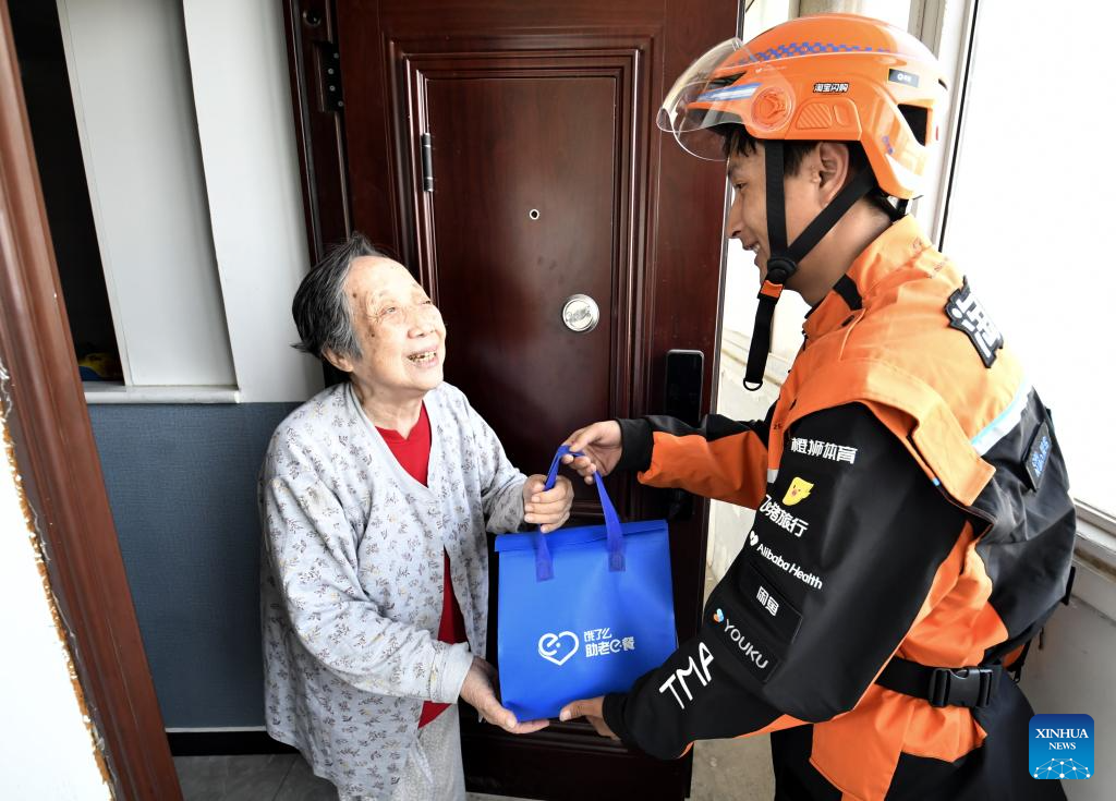 A deliveryman delivers meal for a senior woman in Xiangheyuan Neighborhood, Chaoyang District, Beijing, capital of China, Sept. 26, 2025. In recent years, Xiangheyuan Neighborhood of Chaoyang District has been actively developing a senior-friendly meal service network to meet the dietary needs of its elderly residents. The neighborhood has built two central kitchens and seven senior community canteens. Additionally, it has established a special meal delivery system for the elderly jointly with online platforms, ensuring that the elderly residents here can enjoy healthy and delicious meals. (Xinhua/Li Xin)