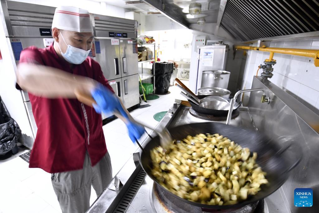 A chef cooks lunch for senior residents at a central kitchen in Xiangheyuan Neighborhood, Chaoyang District, Beijing, capital of China, Sept. 26, 2025. In recent years, Xiangheyuan Neighborhood of Chaoyang District has been actively developing a senior-friendly meal service network to meet the dietary needs of its elderly residents. The neighborhood has built two central kitchens and seven senior community canteens. Additionally, it has established a special meal delivery system for the elderly jointly with online platforms, ensuring that the elderly residents here can enjoy healthy and delicious meals. (Xinhua/Li Xin)