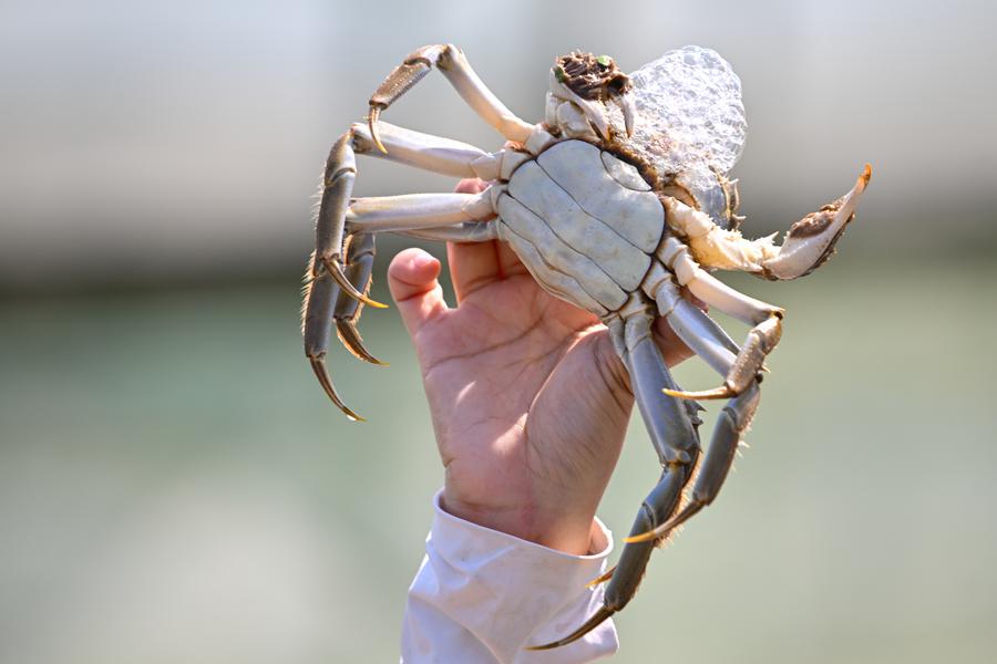 A crab farmer shows a crab freshly harvested from the Yangcheng Lake in Suzhou, east China's Jiangsu Province, on Sept. 26, 2025. (Photo by Wang Xuzhong/Xinhua)