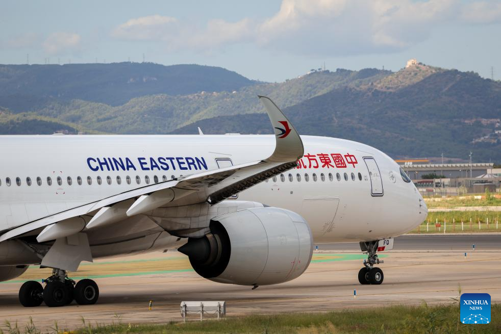 A passenger aircraft of China Eastern Airlines carrying out the inaugural flight from Barcelona to Shanghai taxis at El Prat airport in Barcelona, Spain, Sept. 26, 2025. China Eastern Airlines' newly-launched direct route between China's Shanghai and Spain's Barcelona made its inaugural flight on Friday, strengthening air connectivity between the two countries. (Photo by Joan Gosa/Xinhua)