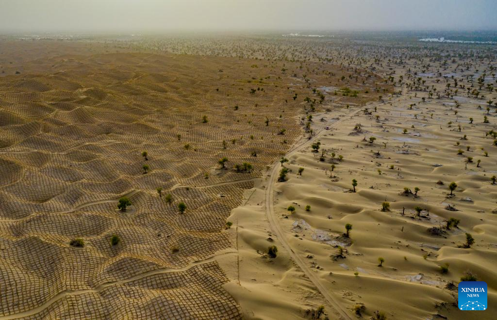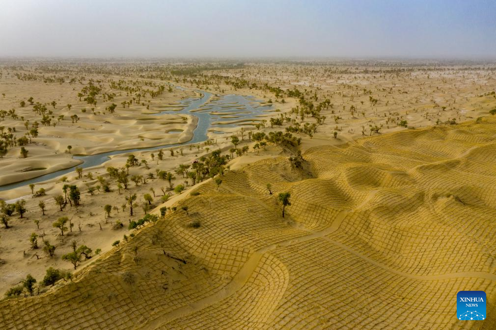 An aerial drone photo taken on Sept. 19, 2025 shows wild populus euphratica and straw checkerboards in Taklimakan Desert in Yuli County, Mongolian Autonomous Prefecture of Bayingolin, northwest China's Xinjiang Uygur Autonomous Region. (Xinhua/Chen Shuo)