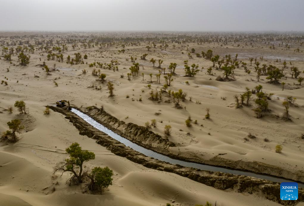 An aerial drone photo taken on Sept. 19, 2025 shows an artificially excavated ecological canal for flood diversion and water replenishment in Taklimakan Desert in Yuli County, Mongolian Autonomous Prefecture of Bayingolin, northwest China's Xinjiang Uygur Autonomous Region. (Xinhua/Chen Shuo)