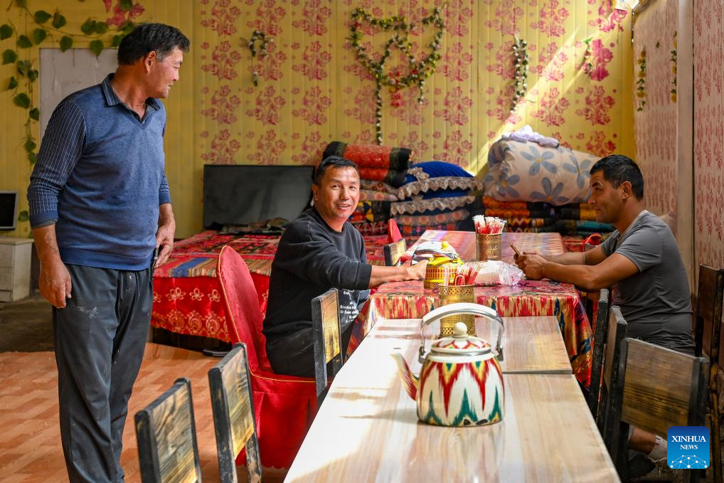 A villager (L) talks with guests at his homestay in Karquga Township of Yuli County, Mongolian Autonomous Prefecture of Bayingolin, northwest China's Xinjiang Uygur Autonomous Region, Sept. 20, 2025. (Xinhua/Chen Shuo)