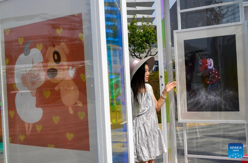 An artist introduces her artwork at an exhibition of the 2025 Grand Canal Public Art Season in Beijing, capital of China, Oct. 1, 2025. The 2025 Grand Canal Public Art Season kicked off here on Wednesday, enabling the public to experience the charm of art through interactive experiences. (Xinhua/Jin Liangkuai)