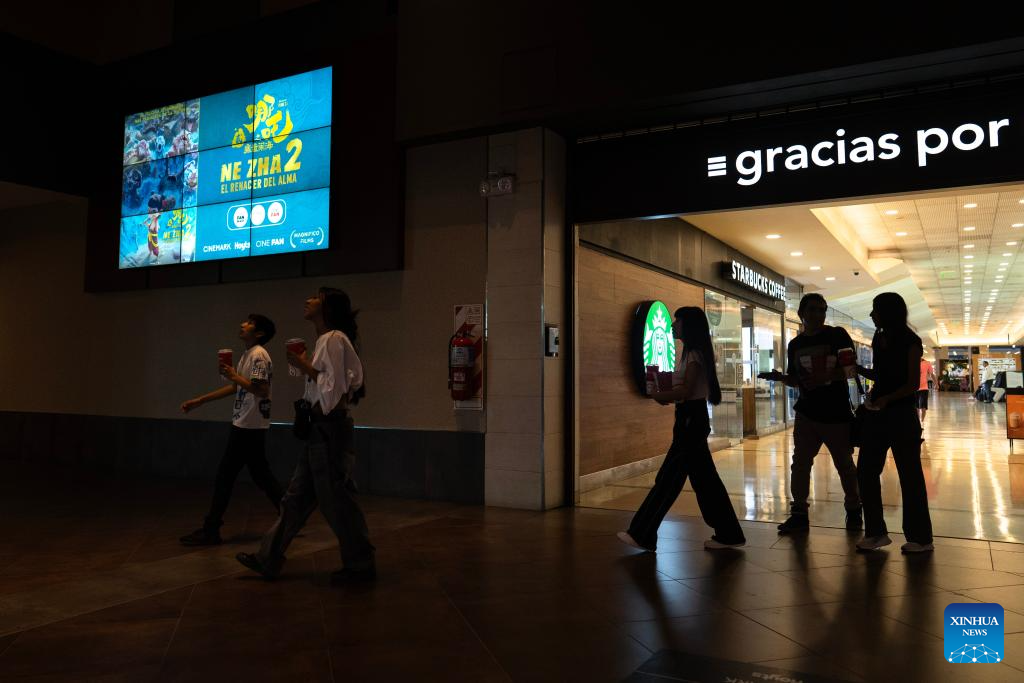 People arrives for the premiere of Chinese animated film "Ne Zha 2" in a cinema in Buenos Aires, Argentina, on Oct. 2, 2025. Chinese animated film "Ne Zha 2" held its premiere in the Argentine capital Buenos Aires on Thursday. (Photo by Martin Zabala/Xinhua)