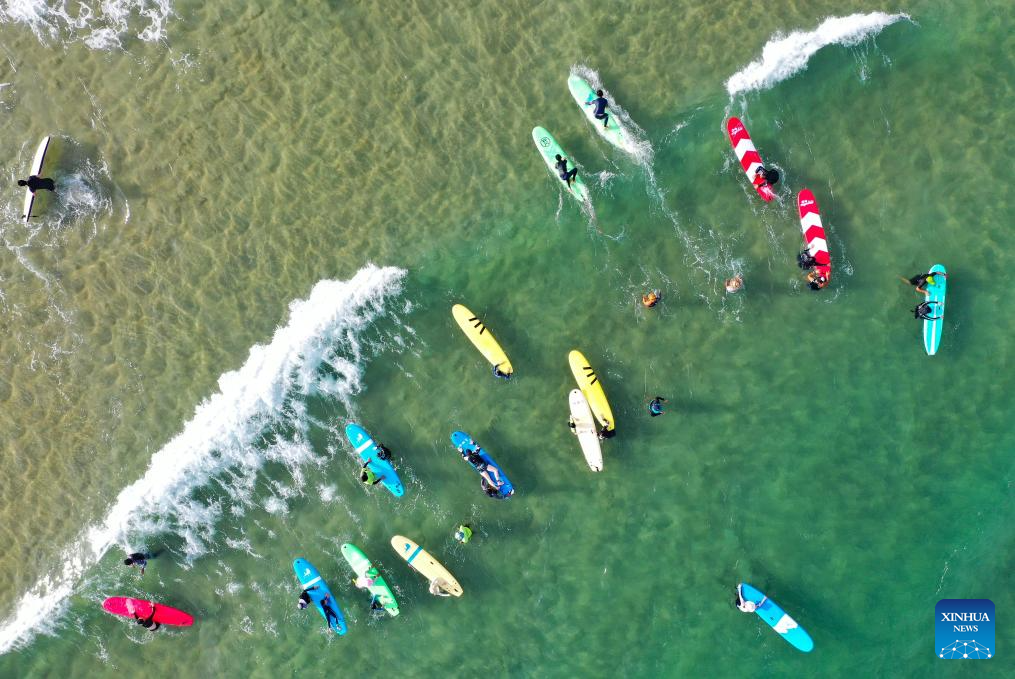 Tourists surf at Riyue Bay in Wanning, south China's Hainan Province, Oct. 2, 2025. Surfing has become a symbol of Wanning thanks to its unique geographical and climatic advantages. (Xinhua/Guo Cheng)