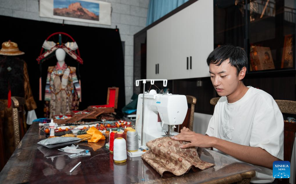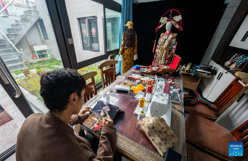 Padruk Tendar designs Tibetan costume at home in Lhasa, southwest China's Xizang Autonomous Region, Sept. 11, 2025. (Xinhua/Tenzin Nyida)