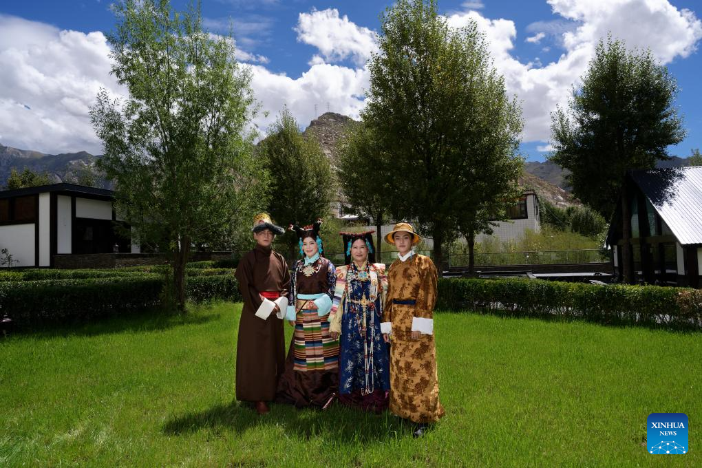 Padruk Tendar (1st R) adjusts Tibetan costume accessories for a model in Lhasa, southwest China's Xizang Autonomous Region, Sept. 9, 2025. (Xinhua/Jigme Dorje)