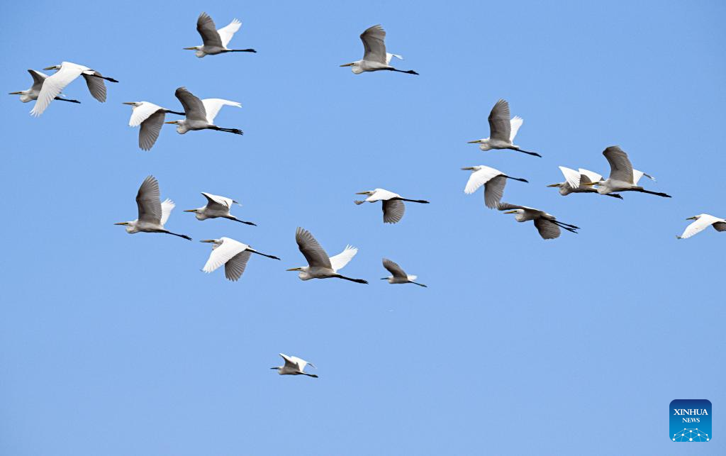 Egrets fly over the Haiwei National Wetland Park in Changjiang Li Autonomous County, south China's Hainan Province, Oct. 2, 2025. Following ecological restoration and facility construction, Haiwei National Wetland Park has recently reopened to the public. The park serves as a crucial habitat for migratory birds.