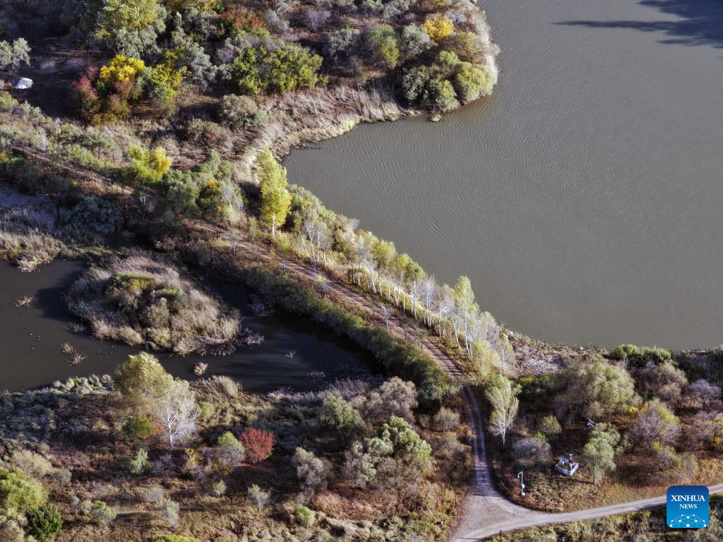 An aerial drone photo taken on Oct. 7, 2025 shows the autumn scenery of a wetland park in Harbin, northeast China's Heilongjiang Province. With abundant wetland resources, Harbin has been vigorously constructing wetland tourism area for leisure travel to tap its unique natural and historical resources. (Xinhua/Wang Song)