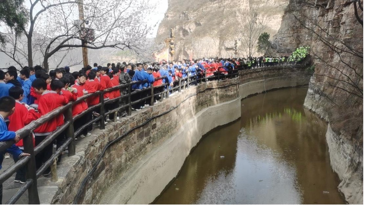 Photo taken on March 28, 2024 shows students visiting Red Flag Canal in Linzhou, Anyang, central China's Henan Province. (People's Daily Online/Zhang Kaiwei)