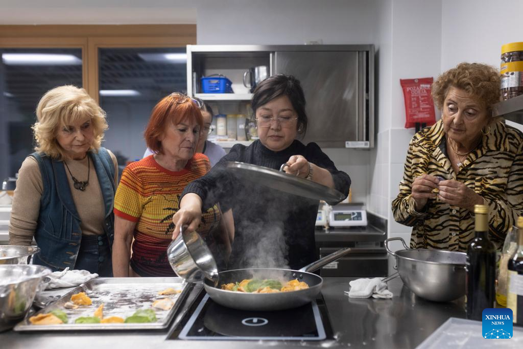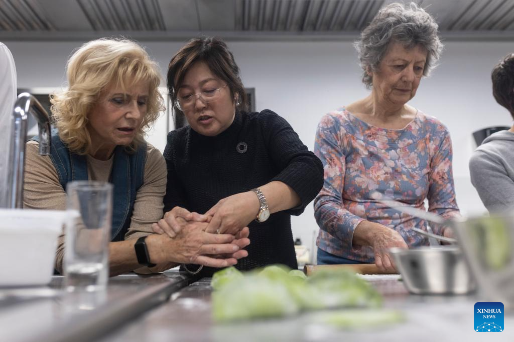 Participants learn to make dumplings at a Chinese cuisine class held by the Confucius Institute Ljubljana in Ljubljana, Slovenia, on Oct. 9, 2025. (Photo by Zeljko Stevanic/Xinhua)