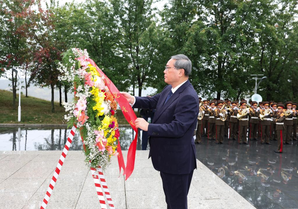 Chinese Premier Li Qiang, also a member of the Standing Committee of the Political Bureau of the Communist Party of China Central Committee, pays homage to the martyrs of the Chinese People's Volunteer Army (CPV) at a cemetery in Anju, the Democratic People's Republic of Korea (DPRK), Oct. 10, 2025. This year marks the 75th anniversary of the CPV's participation in the War to Resist U.S. Aggression and Aid Korea. (Xinhua/Ding Haitao)