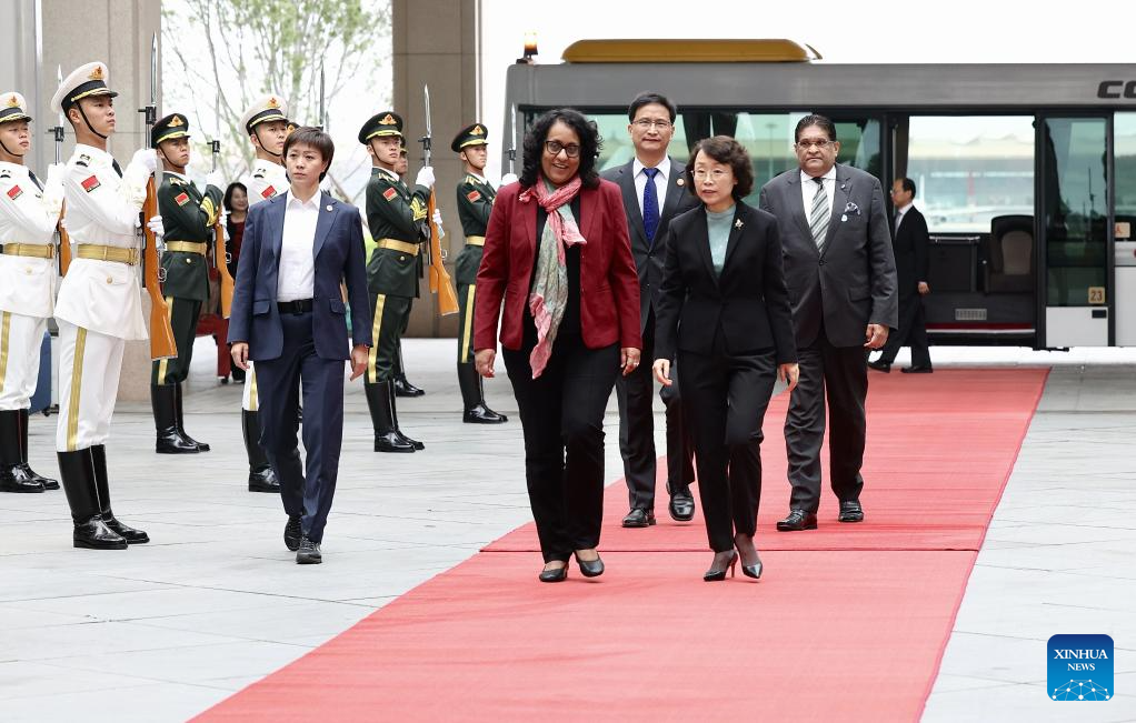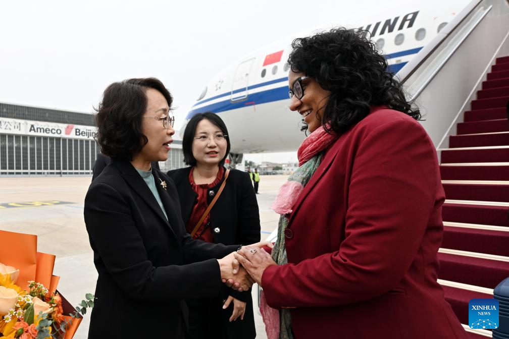 Sri Lankan Prime Minister Harini Amarasuriya arrives in Beijing, capital of China, on Oct. 12, 2025, for the upcoming Global Leaders' Meeting on Women. (Xinhua/Zhang Yuwei)
