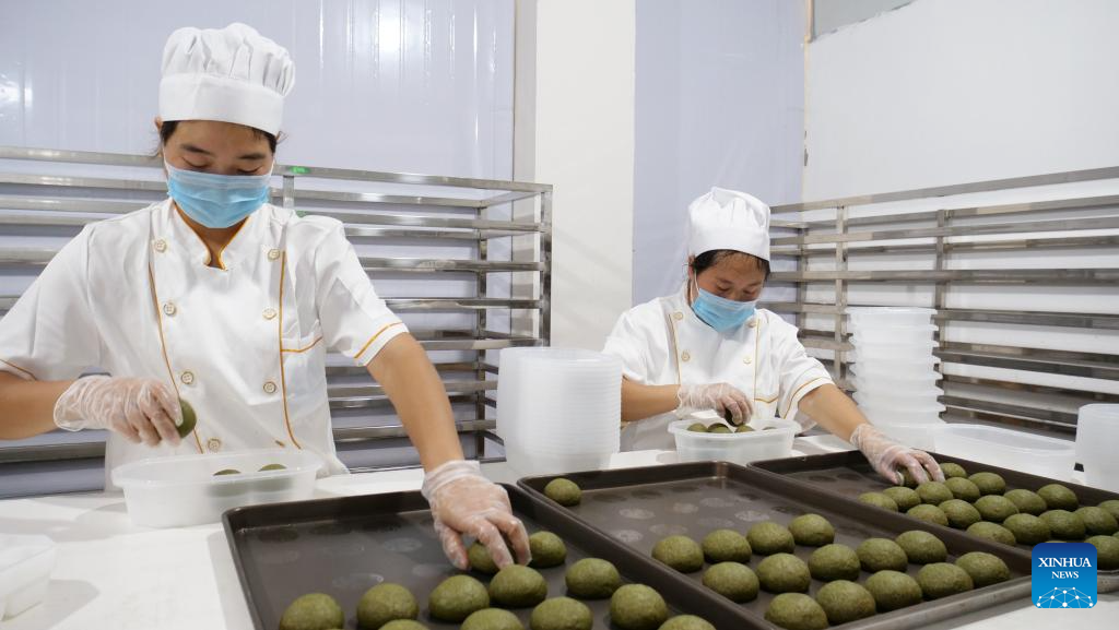 Staff members make matcha mooncakes at a food company in Jiangkou County, southwest China's Guizhou Province, Sept. 3, 2025. (Xinhua)