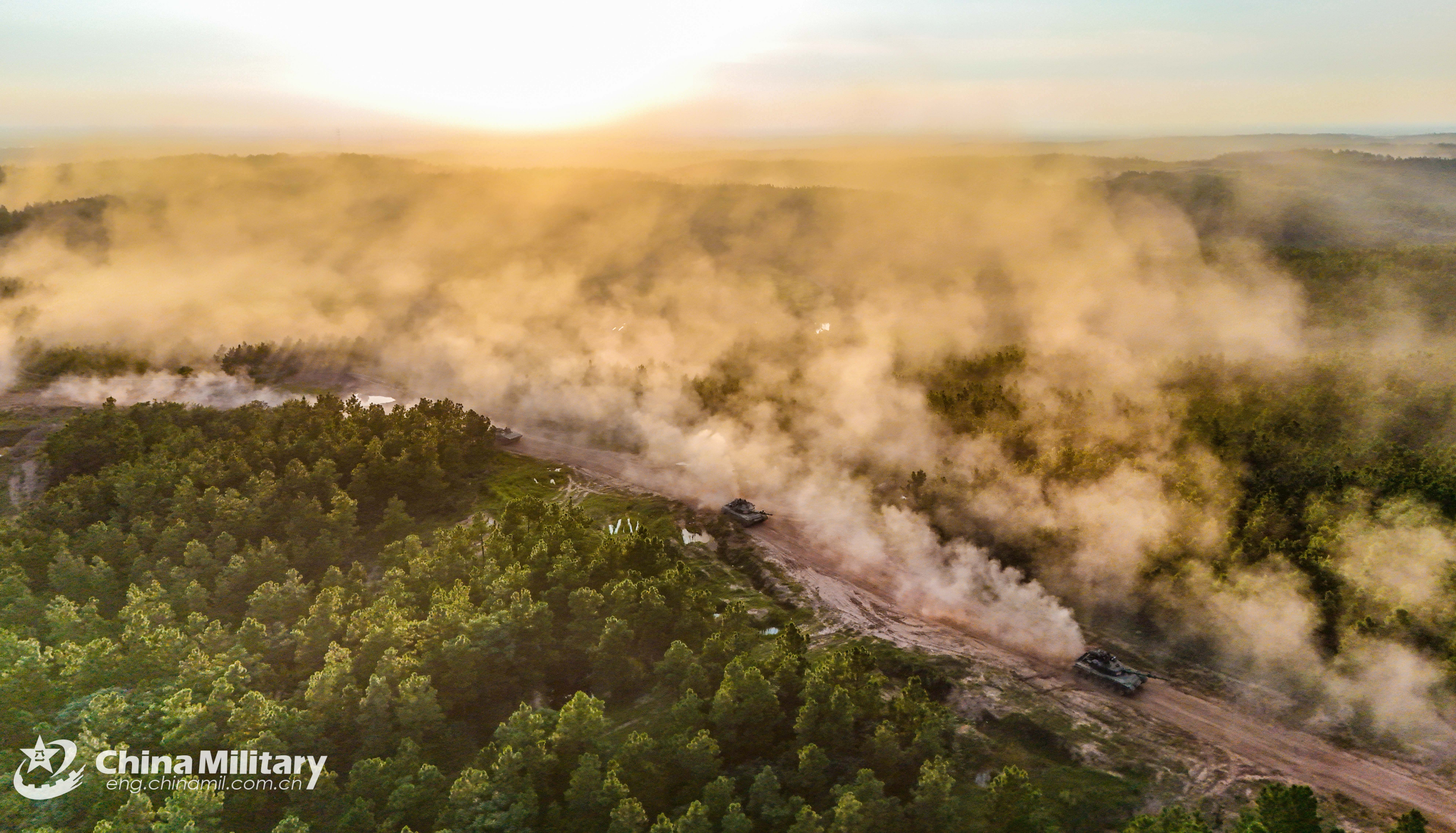 Main battle tanks (MBTs) attached to a combined-arms brigade under the Chinese PLA 71st Group Army kick up plumes of dust during a maneuver training exercise in late September, 2025. (eng.chinamil.com.cn/Photo by Lin Weihong)