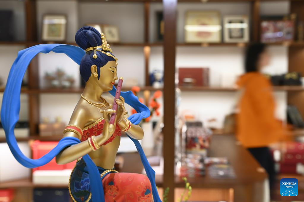 A tourist tries clay sculpture making at the Dunhuang Book Center in Dunhuang, northwest China's Gansu Province, Oct. 11, 2025. In recent years, Dunhuang has advanced the development of immersive cultural and tourism experience projects. By renovating unused buildings, new cultural landmarks centered on Dunhuang culture have been created, including the Dunhuang Book Center, Dunhuang Press, and Dunhuang Unbounded art gallery. These cultural attractions combining cultural consumption, art exhibitions, interactive experiences, and social activities attract a large number of visitors. (Xinhua/Fan Peishen)