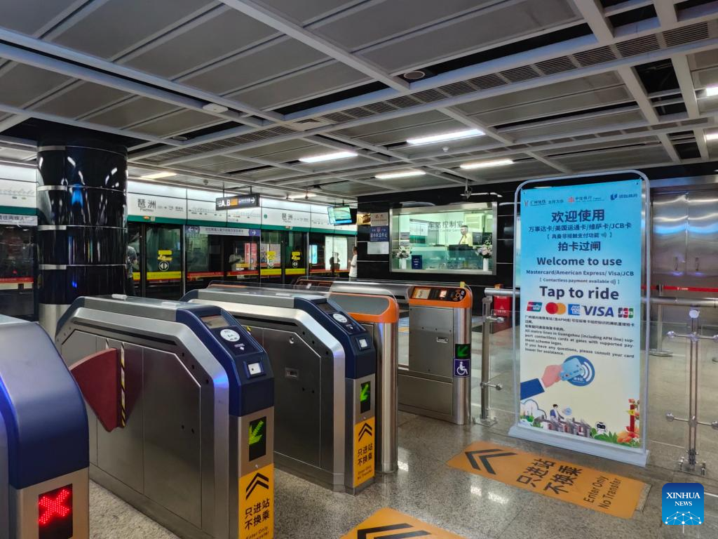 This photo taken on Oct. 11, 2025 shows a banner promoting contactless payments with major international bank cards beside fare gates at a metro station in Guangzhou, south China's Guangdong Province. (Guangzhou Metro/Handout via Xinhua)