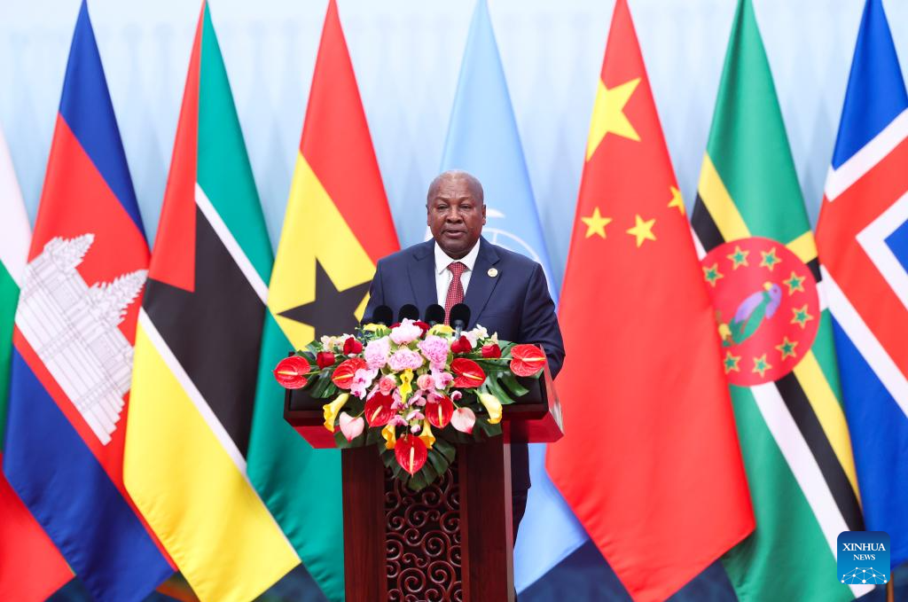 Ghanaian President John Dramani Mahama delivers a speech at the opening ceremony of the Global Leaders' Meeting on Women in Beijing, capital of China, Oct. 13, 2025. (Xinhua/Huang Jingwen)