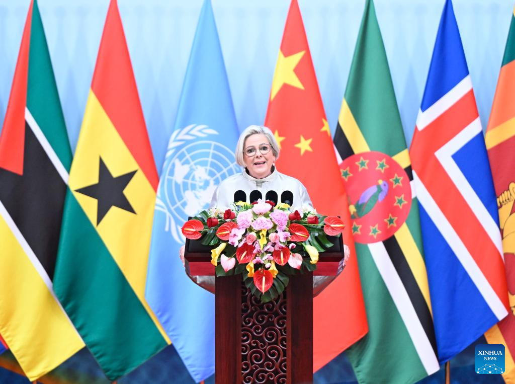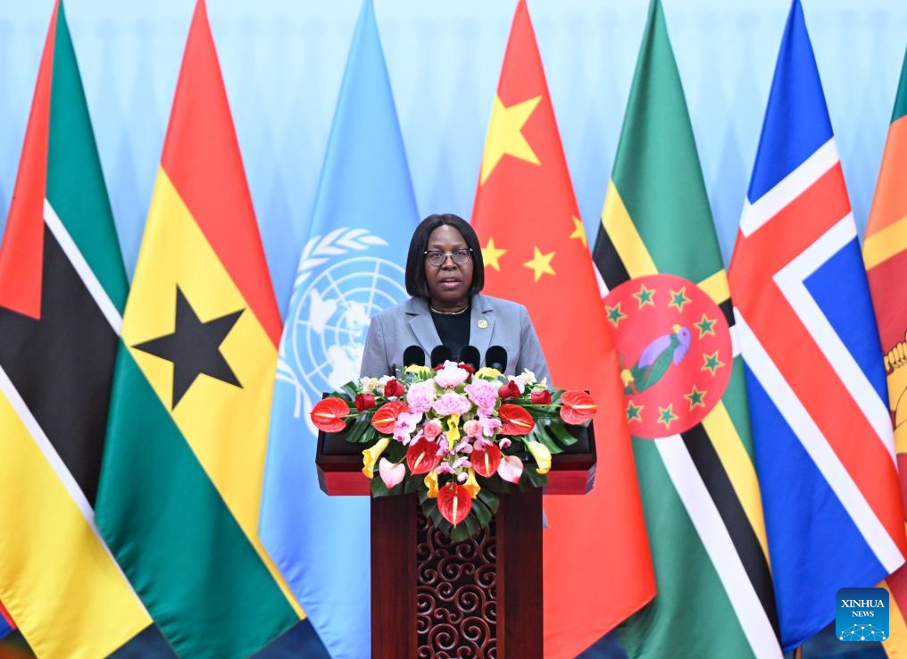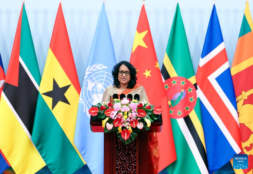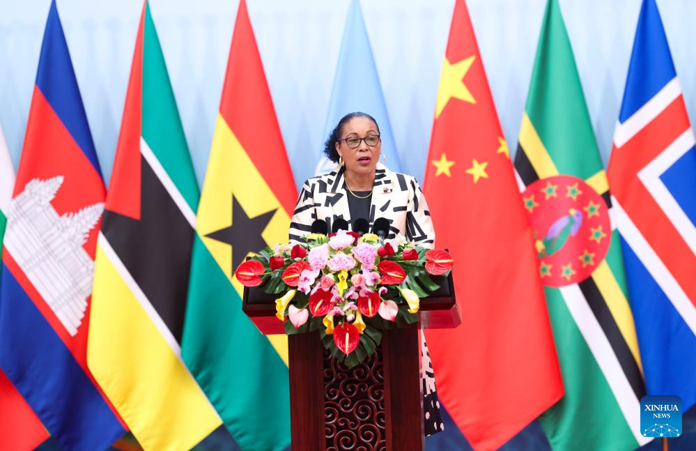 President of the Commonwealth of Dominica Sylvanie Burton delivers a speech at the opening ceremony of the Global Leaders' Meeting on Women in Beijing, capital of China, Oct. 13, 2025. (Xinhua/Huang Jingwen)