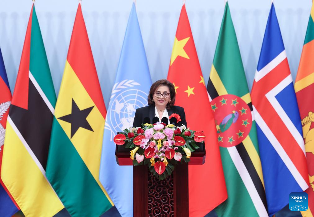 Sima Bahous, UN Under-Secretary General and UN Women Executive Director, delivers a speech at the opening ceremony of the Global Leaders' Meeting on Women in Beijing, capital of China, Oct. 13, 2025. (Xinhua/Yao Dawei)