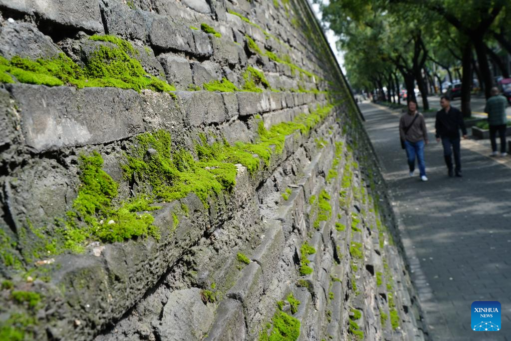 People walk along the city wall in Xi'an, northwest China's Shaanxi Province, Oct. 13, 2025. After the continuous autumn rain, moss and other plants have covered the city wall with a green coat, attracting people to watch and take photos.