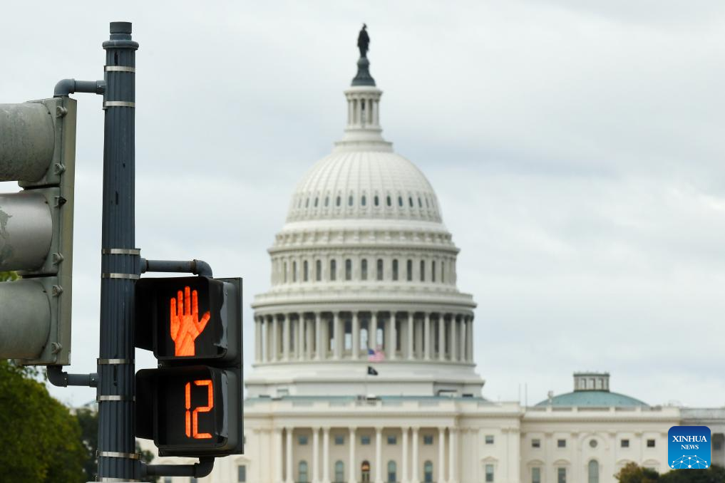 This photo taken on Oct. 12, 2025 shows the U.S. Capitol building behind a traffic light in Washington, D.C., the United States. The federal government shutdown entered its 12th day. (Xinhua/Li Rui)