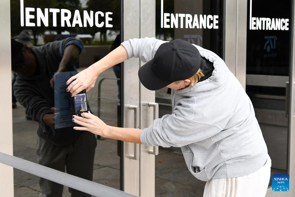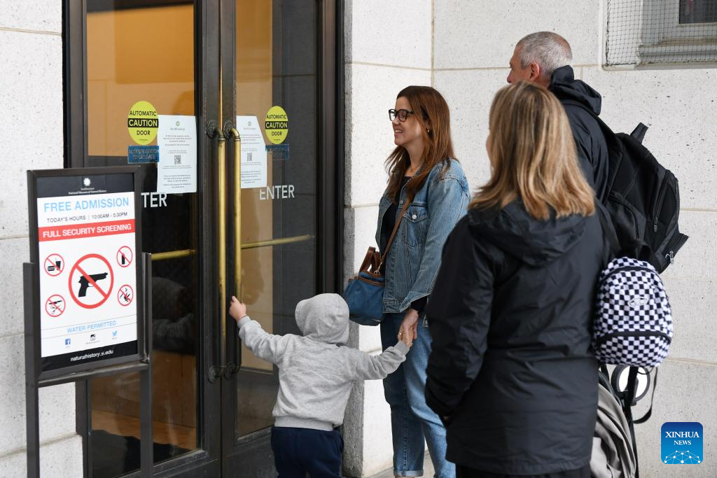 Visitors look at notices of closure posted at the entrance of the National Museum of Natural History in Washington, D.C., the United States, Oct. 12, 2025. The federal government shutdown entered its 12th day. (Xinhua/Li Rui)
