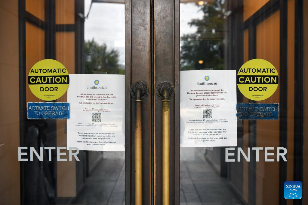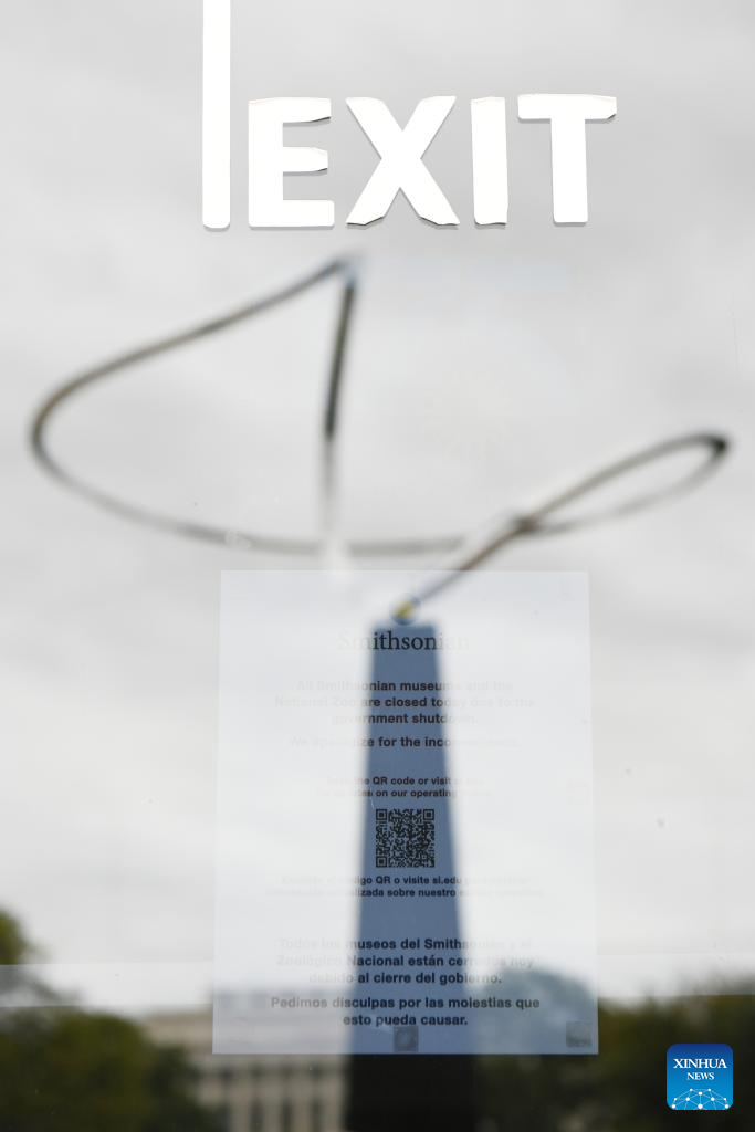 A notice of closure is posted at the entrance of the National Museum of American History in Washington, D.C., the United States, Oct. 12, 2025. The federal government shutdown entered its 12th day. (Xinhua/Li Rui)