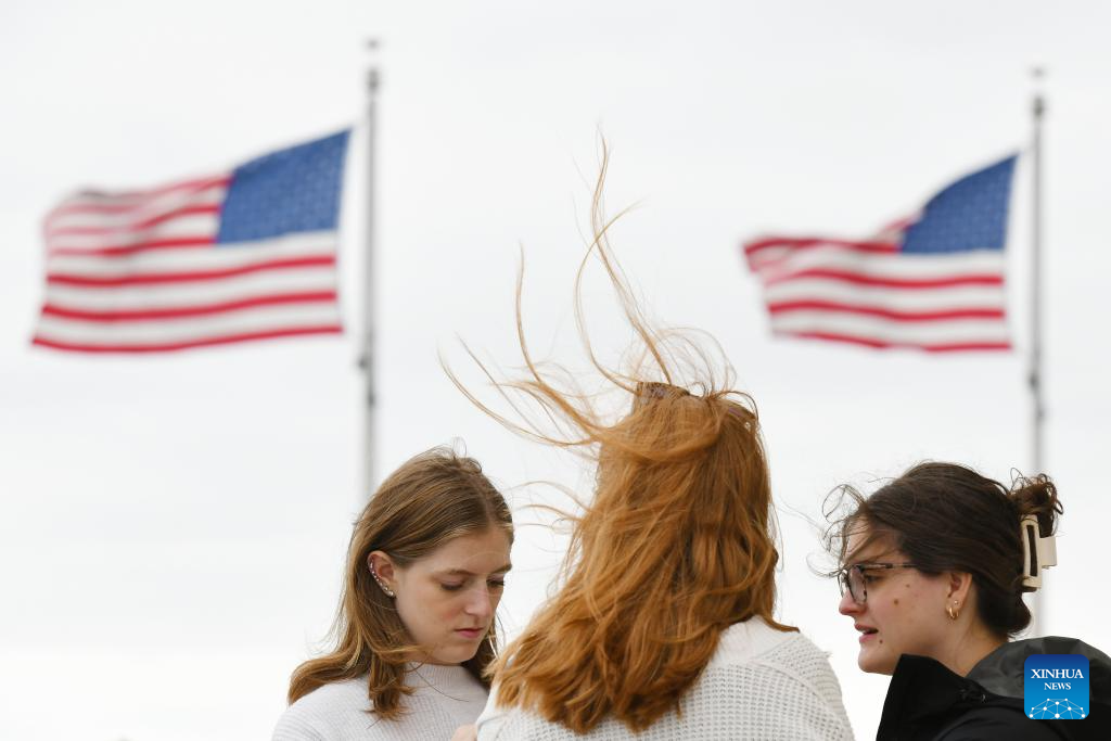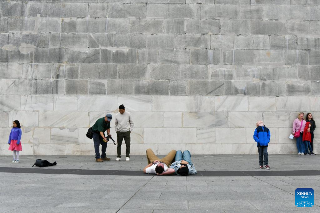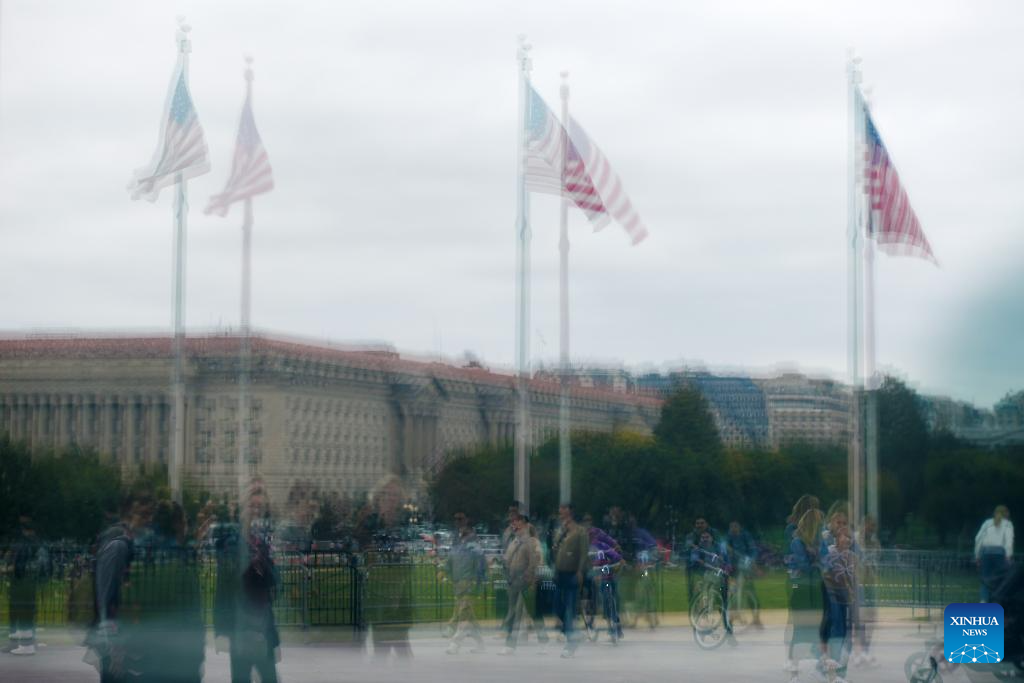 People are seen in front of the Washington Monument in Washington, D.C., the United States, Oct. 12, 2025. The federal government shutdown entered its 12th day. (Xinhua/Li Rui)