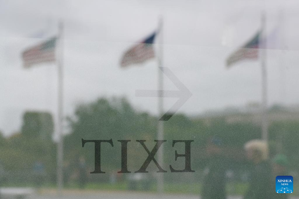 People are seen reflected in the glass of the Washington Monument's visitor center in Washington, D.C., the United States, Oct. 12, 2025. The federal government shutdown entered its 12th day. (Xinhua/Li Rui)