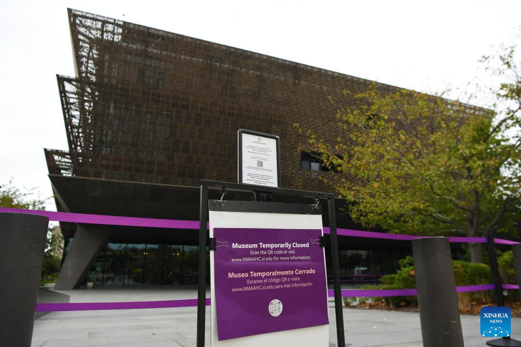 Notices of closure are posted at the entrance of the National Museum of African American History and Culture in Washington, D.C., the United States, Oct. 12, 2025. The federal government shutdown entered its 12th day. (Xinhua/Li Rui)