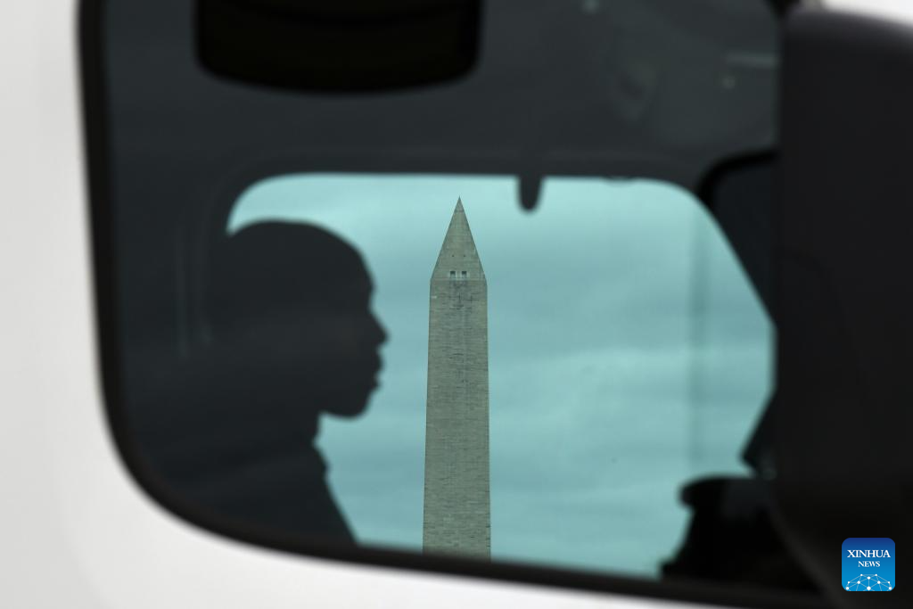 The Washington Monument is pictured through a truck's window in Washington, D.C., the United States, Oct. 12, 2025. The federal government shutdown entered its 12th day. (Xinhua/Li Rui)